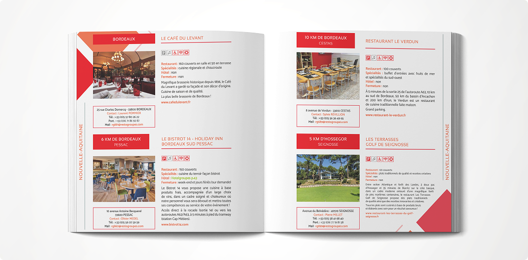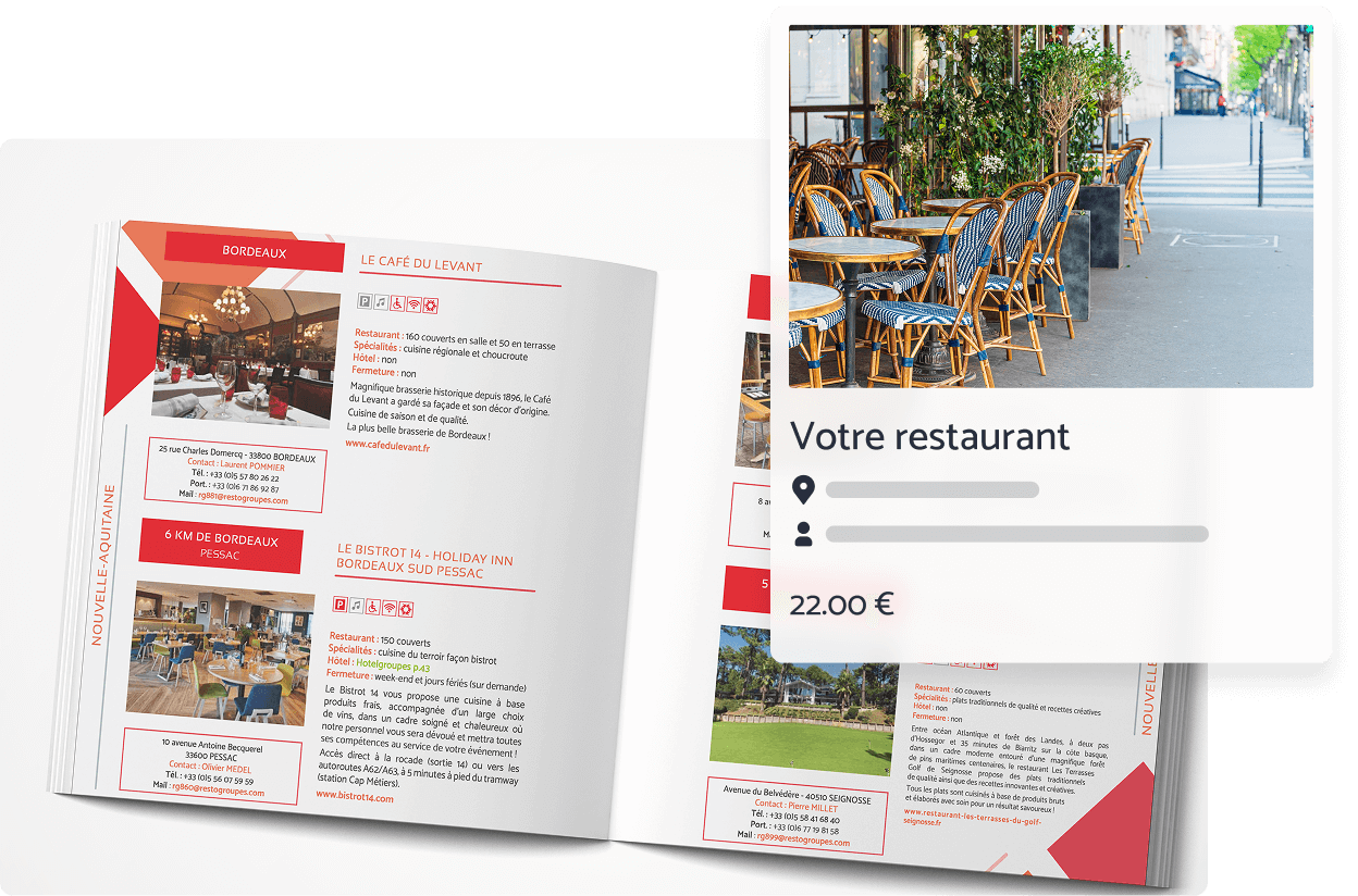 Le guide Restogroupes est diffusé à 6 000 exemplaires papier et 20 000 envois digitaux. Traduit en anglais, espagnol, italien et allemand, il présente de manière claire et synthétique les informations essentielles sur votre restaurant, afin de le rendre visible auprès d’un large public de professionnels et d’organisateurs de groupes.